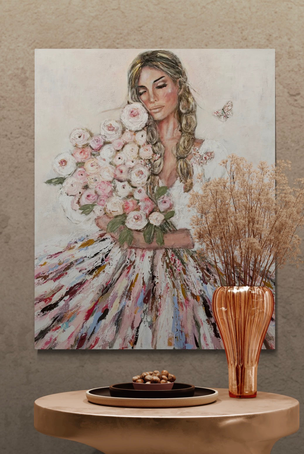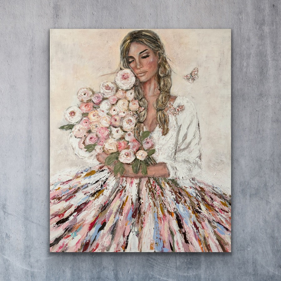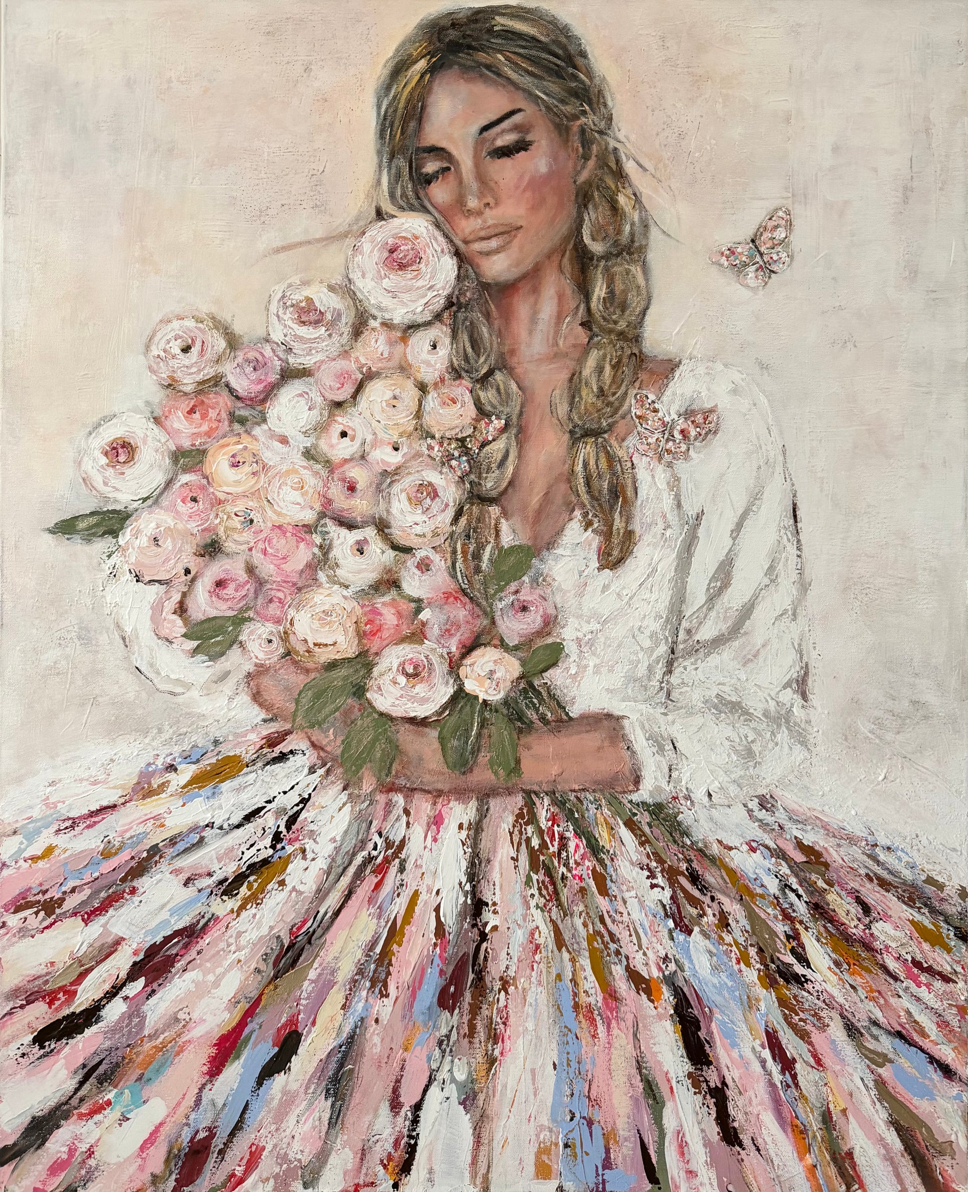 Hon bär stillheten inom sig. En stund där världen saktar ner och andetaget blir mjukt. Blommorna hon håller symboliserar det vi ibland glömmer i vardagens brus –