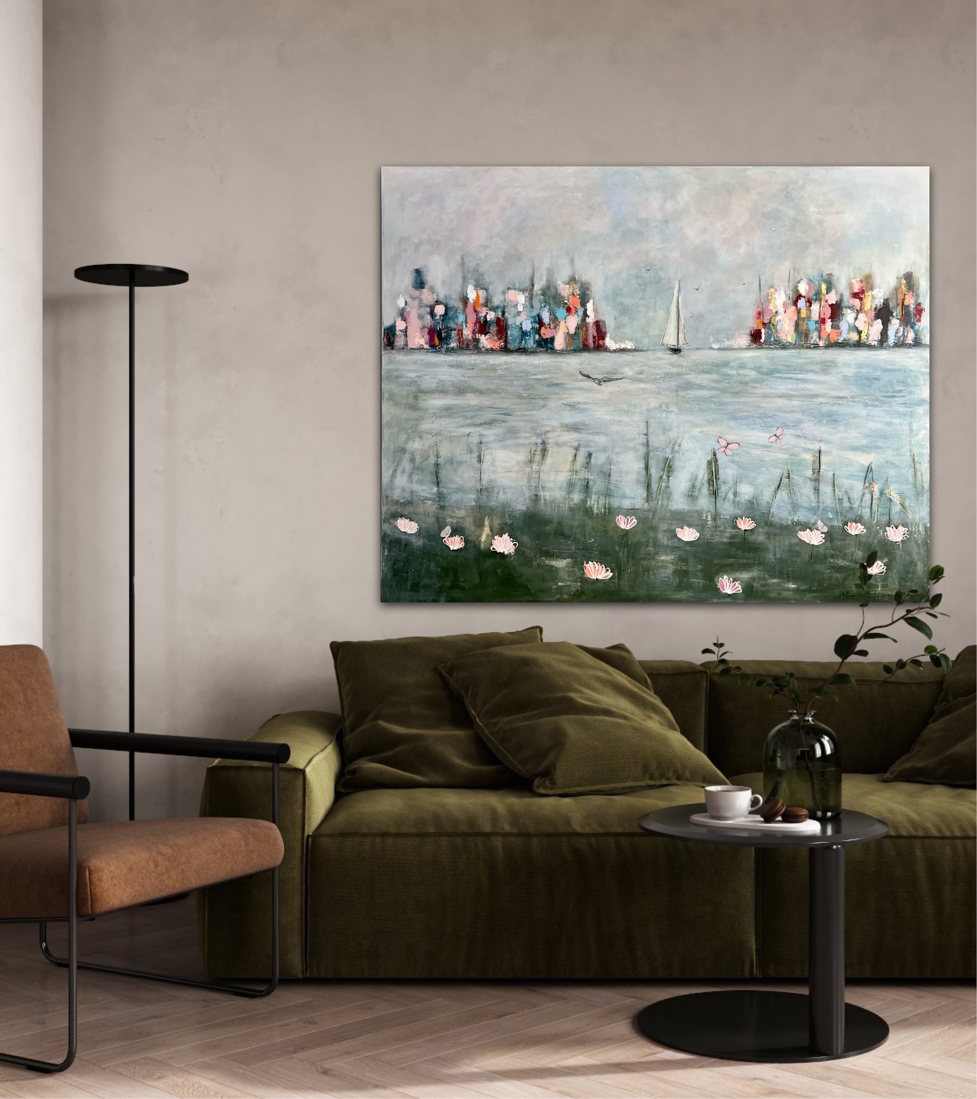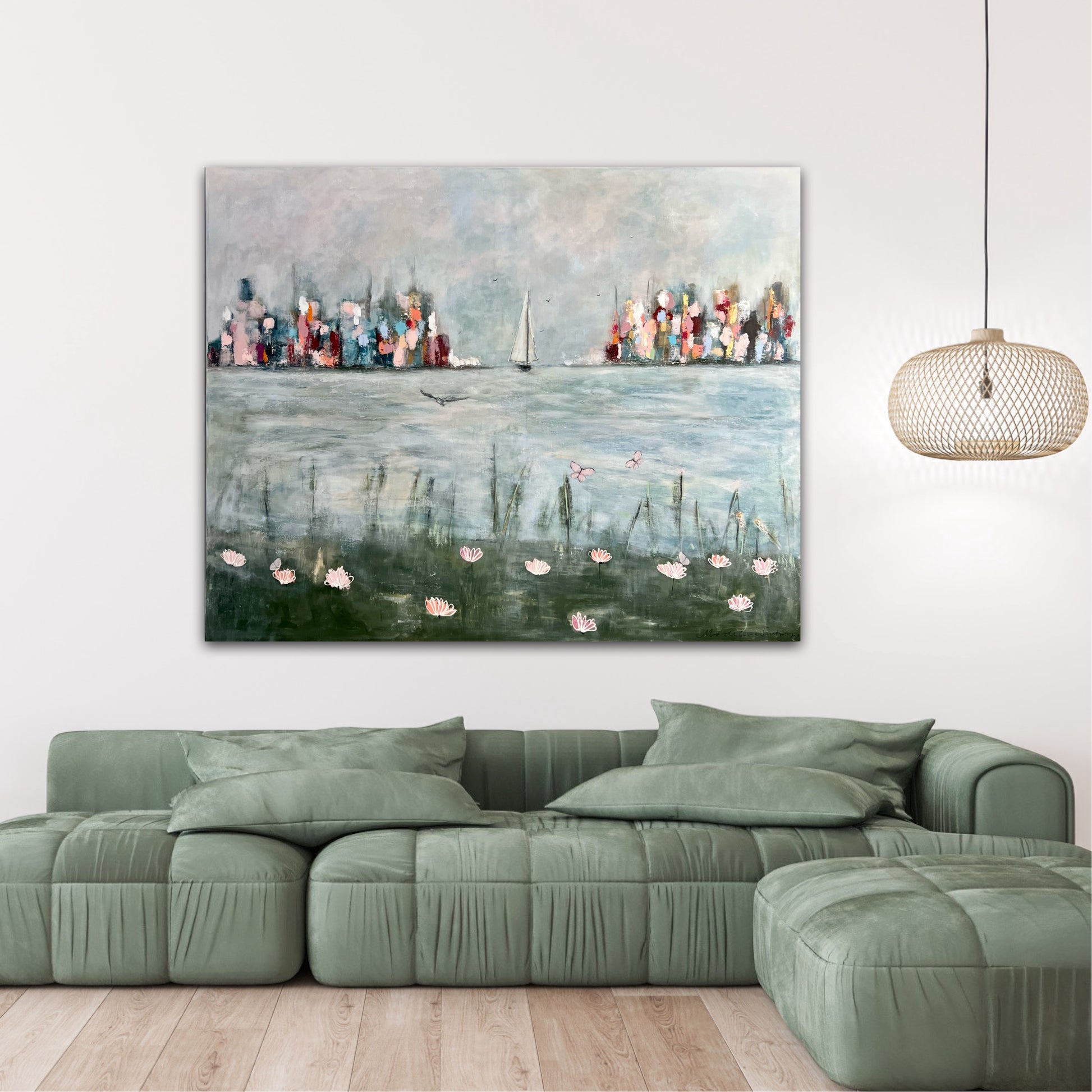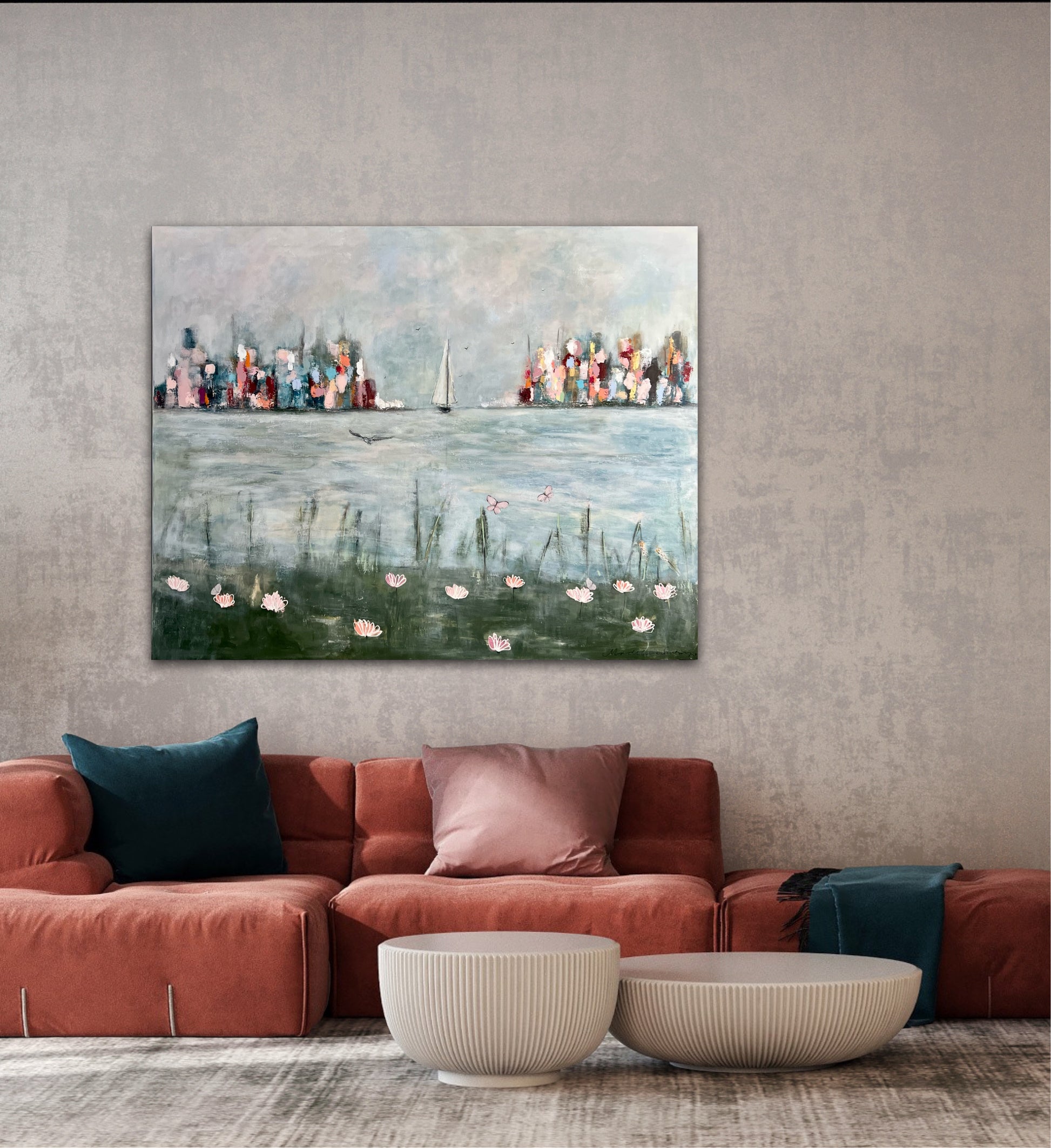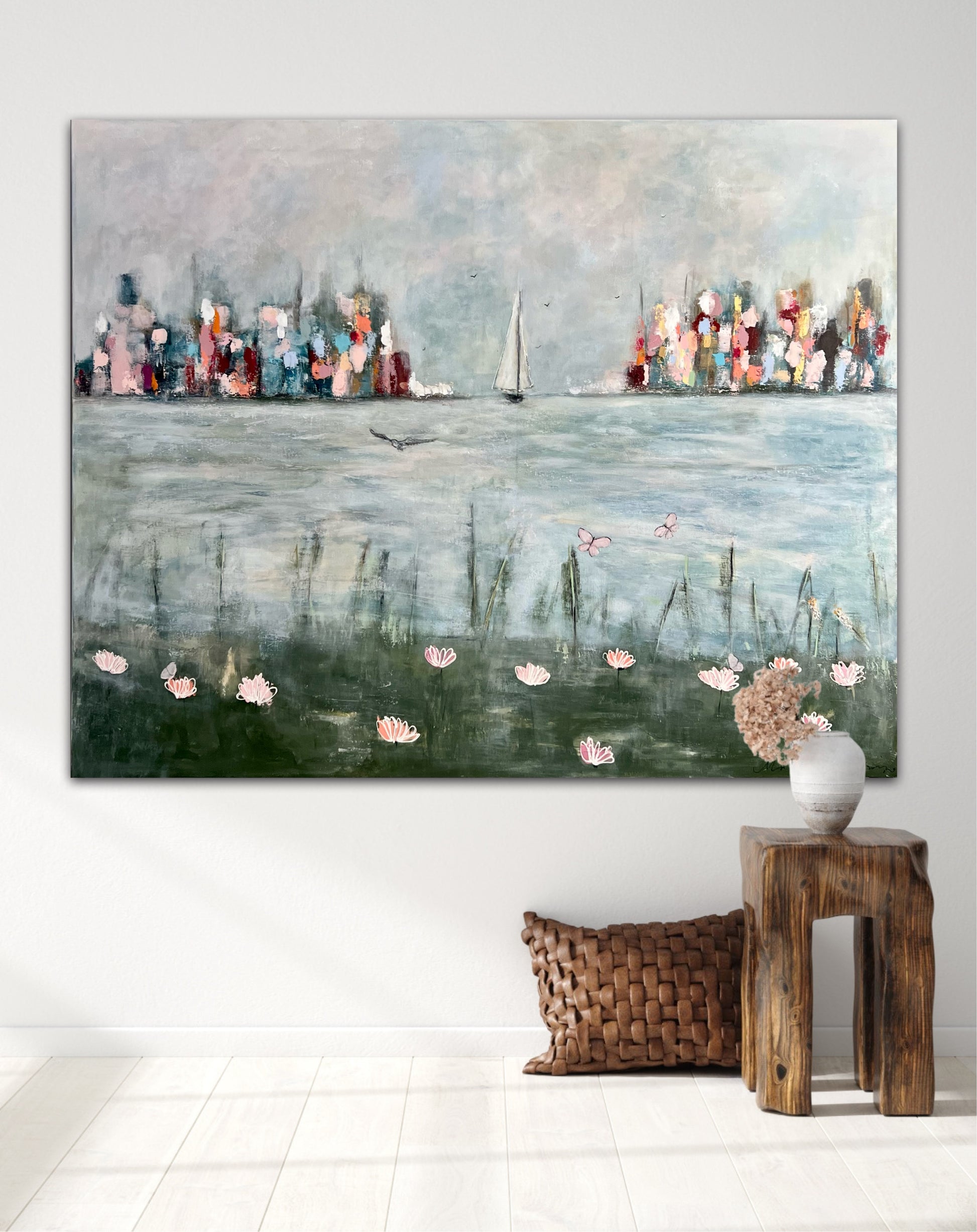 Stor målning där jag ville skapa ett lugn med endast ett fåtal färger. Ett hav, segelbåtar och en stad på distans. En slags öppenhet med ett kärleksfullt gensvar tillbaka.